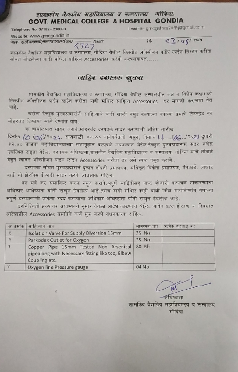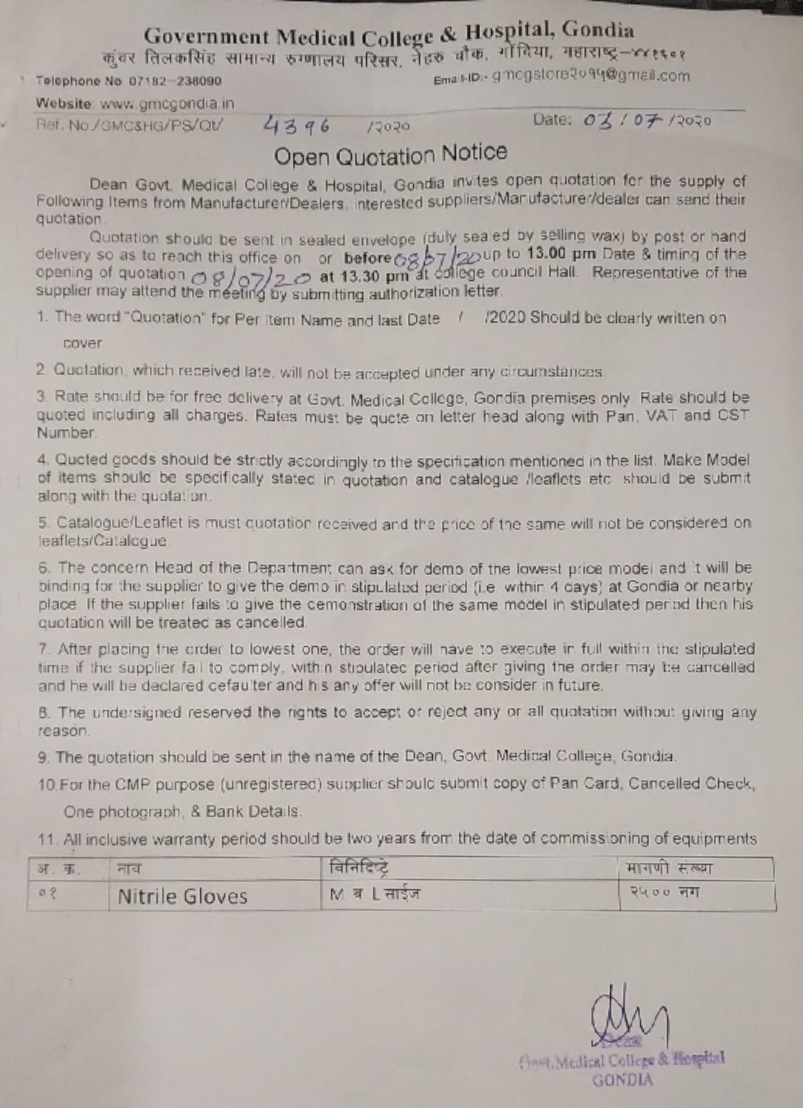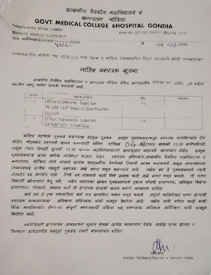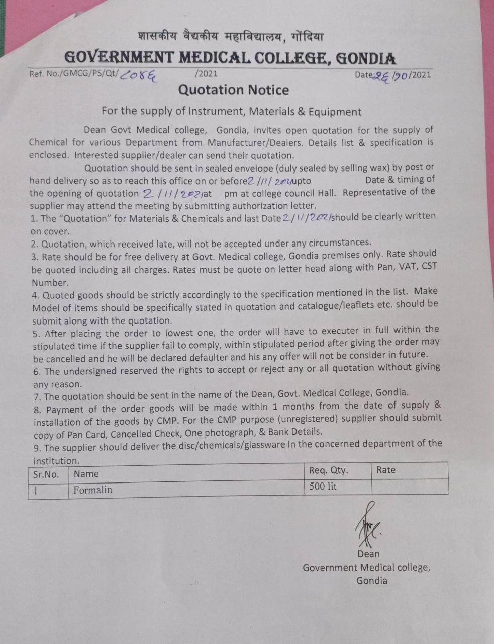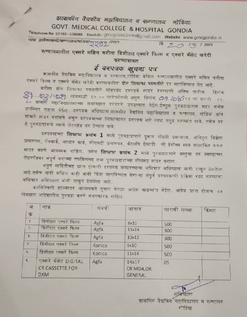 Current and past tenders, quotations, and procurement notices from Government Medical College Gondia
